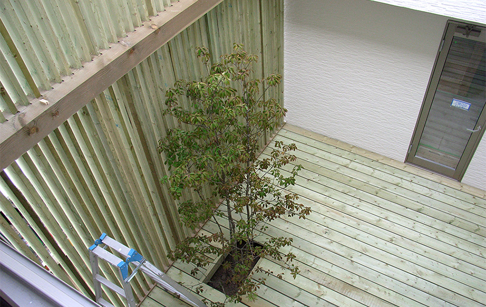 吹き抜けのようなウッドテラスを囲うように居住スペースを配置。 シャープな印象の外観からは想像できない開放感が広がる。