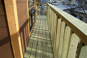 吹き抜けのようなウッドテラスを囲うように居住スペースを配置。 シャープな印象の外観からは想像できない開放感が広がる。